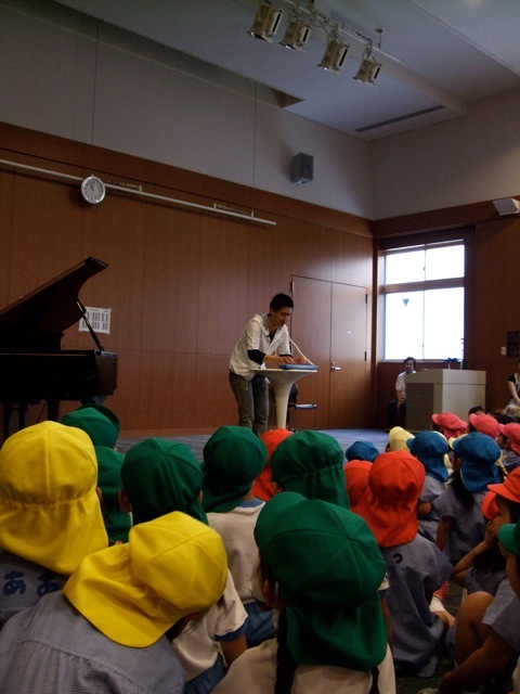 A1遊びうたグランプリ決勝戦で活躍したムッシュ香月さんの紹介で、四條畷幼稚園に来ました!子どもたち200人以上と保護者、先生たちが集まりました!このホールは短大のホールで素晴らしい空間でした。