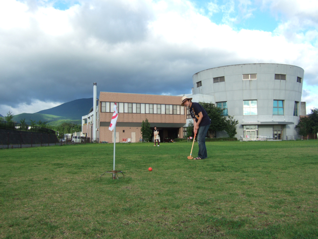 飛行機まで若干時間があったので施設の外でグランドゴルフで中川さんと対決!8ホール周って3打差で中川さんの勝利。いい汗かいてこれから飛行機乗ります。