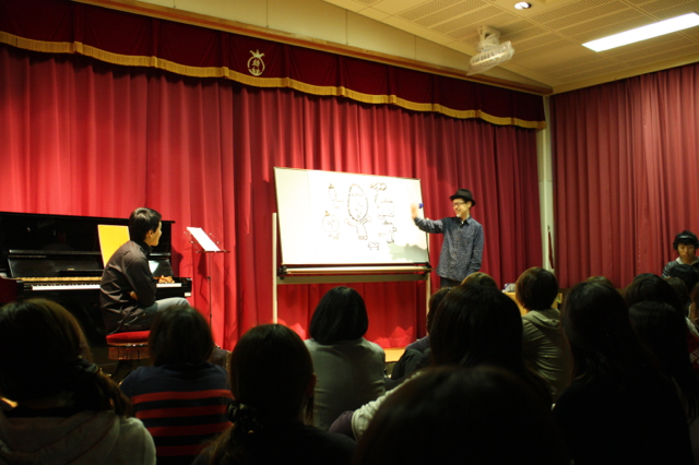 和やかな雰囲気に。その後、マジックショーの予定だったが、先生達がこどもたちに出来るマジックをいくつか伝授した。ピアニカショーの後は、絵本と音楽シアター。中でも、はせぼん新作の「まわるおすし」は緊張感ある音楽が付いて、非常に盛り上がった。アンコールは、音楽とLIVEペインティング。