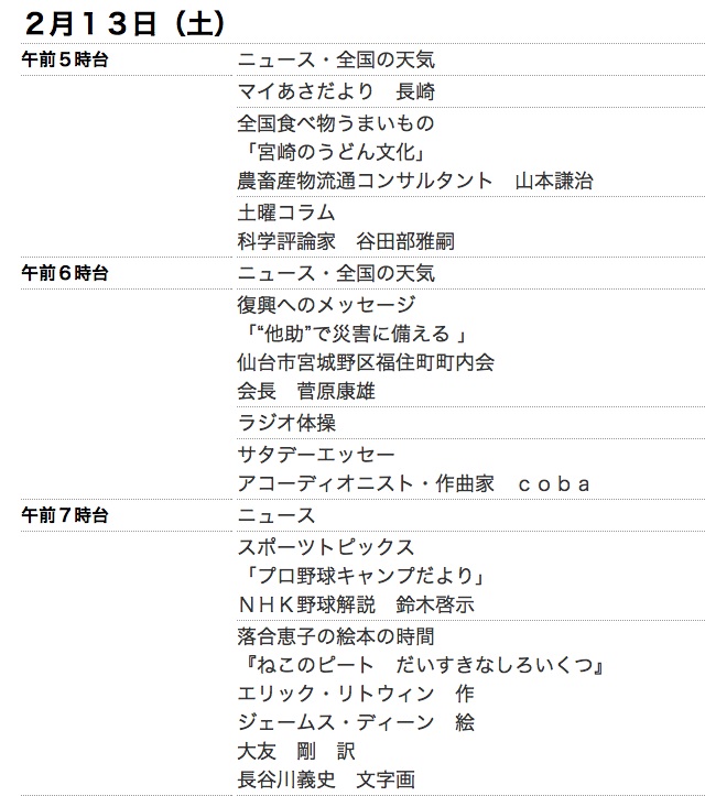 2016年2月13日 7:32~ 土曜日のNHK第1ラジオで、