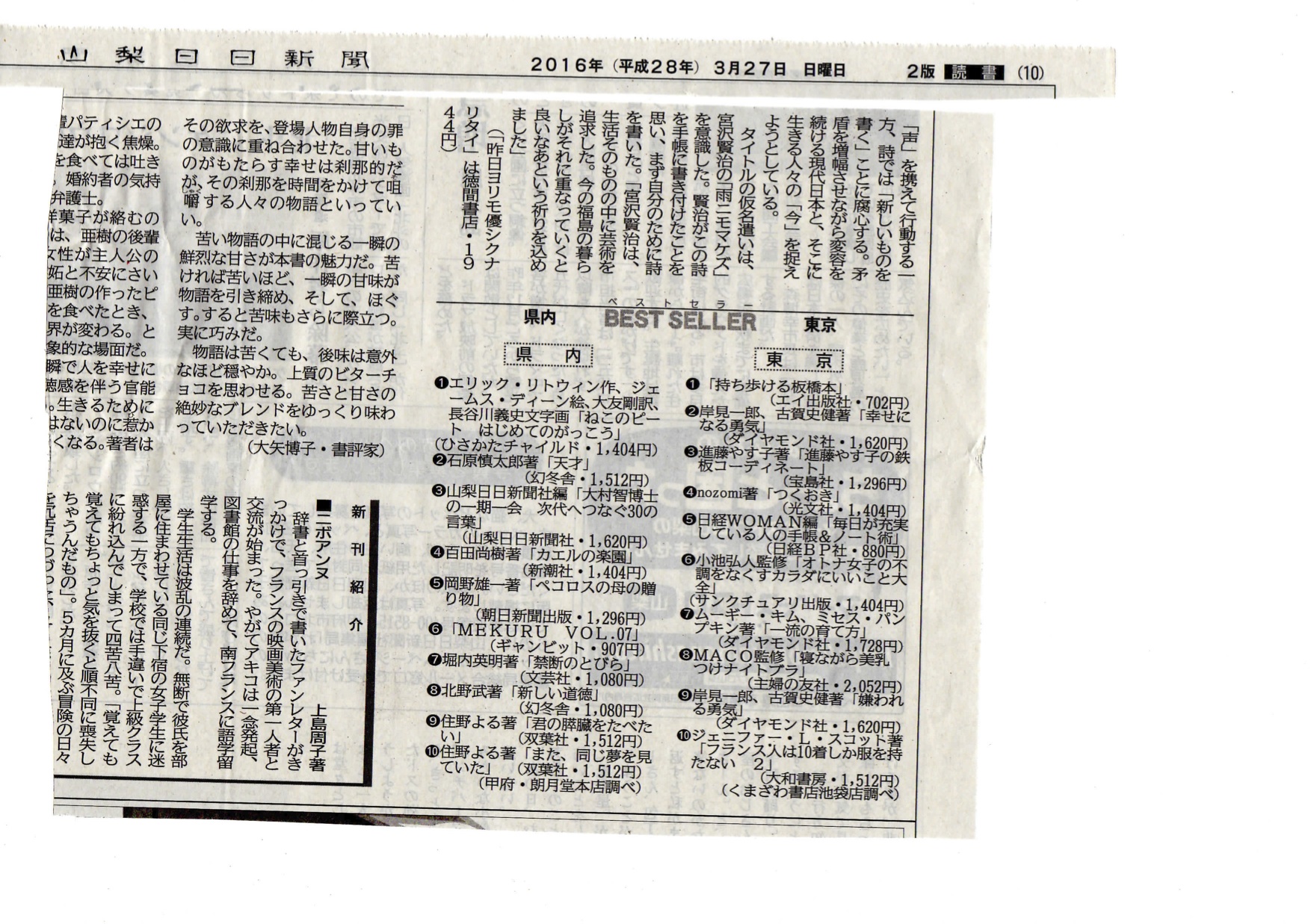 2016.03.27 3/27山梨日日新聞 県内「書籍ランキング」一位! 3/27山梨日日新聞「県内書籍ランキング」で『ねこのピート』第1位になりました。 絵本ランキングではなくて、書籍ランキングというのが驚きです。 山梨に移住してちょうど2年が経ちますが、 活動やピートが浸透して来た感じがします。これからもよろしくお願いします! 大友剛