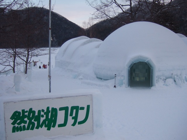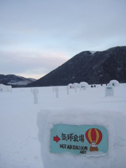 2010.01.30 コタン村到着! 然別湖つきました。 この景色に言葉がでません。 神秘的なところです。 湖は凍っていて雪が積もっています。右側に見えるのはコタン村。冬だけ存在する村です。アイスホテル、露天風呂、アイスコンサートホールがあります。今夜の会場です。 明日朝はここで気球に乗ろうかなあ・・・・・